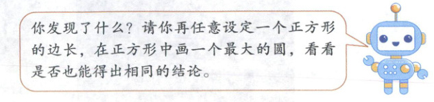 你发现了什么?请你再任意设定一个正方形的边长,在正方形中画一个最大的圆,看看是否也能得出相同的结论。