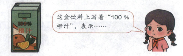 11.“100%橙汁”表示这盒饮料中所含橙汁的成分占全部饮料的百分之一百,即我们平时所说的“纯橙汁”。生活中的百分数有很多,如一杯糖水的含糖率为8%,是指杯中糖的质量占糖水总质量的百分之八。(答案不唯一,合理即可)