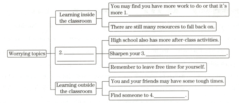 【文章大意】本文是一篇说明文。文章主要从课内学习、课外活动和课外学习三个方面向新生介绍如何适应高中生活。