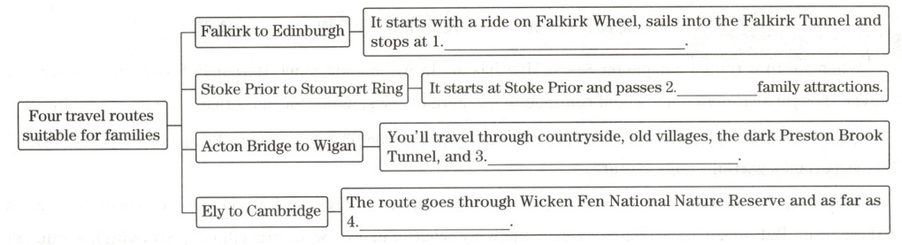 1.A 细节理解题。根据Falkirk to Edinburgh部分“Try water sports on Linlithgow Loch,before continuing across the 810-feet-long Avon Aqueduct...”可知,家庭成员可以在Linlithgow进行水上运动。故选A项。