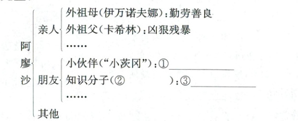 (2)《童年》里人物众多,厘清人物关系能帮助我们更好地了解阿廖沙的成长历程,请将下面的人物关系图补充完整。