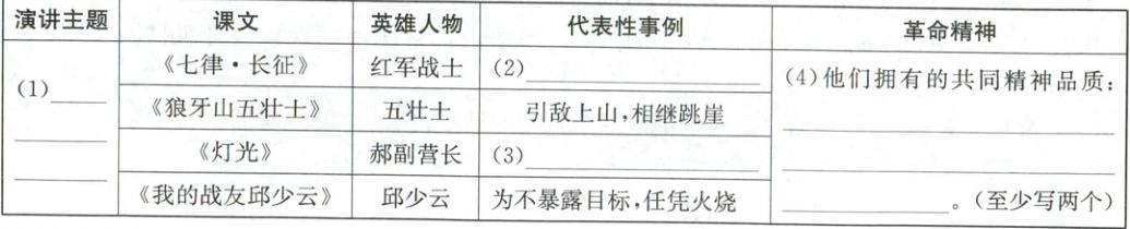 (4)英勇无畏、不畏艰险、不怕牺牲、视死如归、热爱祖国(任写两个即可) 4.示例:我赞同革命烈士永垂不朽的说法,因为他们用自己的行动和牺牲为我们祖国的发展做出了巨大贡献,这种贡献是无法被忘怀和替代的。虽然他们的生命已经逝去,但他们的精神永存,值得我们代代相传。