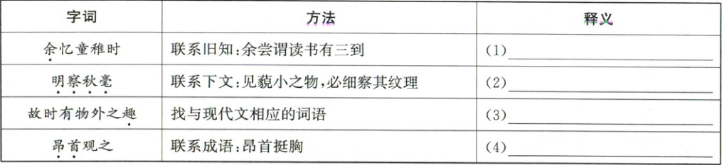余忆童稚时,能张目对日,明察秋毫,见藐小之物,必细察其纹理,故时有物外①之趣。夏蚊成雷②,私③拟作群鹤舞于空中,心之所向,则或千或百,果然鹤也。昂首观之,项④为之强⑤。