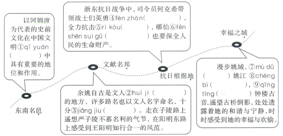 1.读拼音,写词语,了解家乡余姚。(9分)