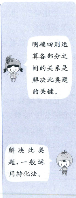 当四则运算中某一个数未知时,可以运用转化法,结合四则运算各部分之间的关系,求出未知的数。