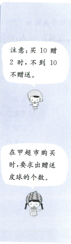 甲超市:每买 10 个皮球赠送 2 个,不足 10 个不赠送。