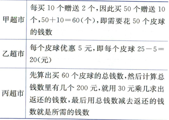 典型例题 光明小学要买 60 个皮球,现在有甲、乙、丙三家超市可以选择,三家超市卖的皮球的单价都是 25 元,但各家超市的优惠活动不同。