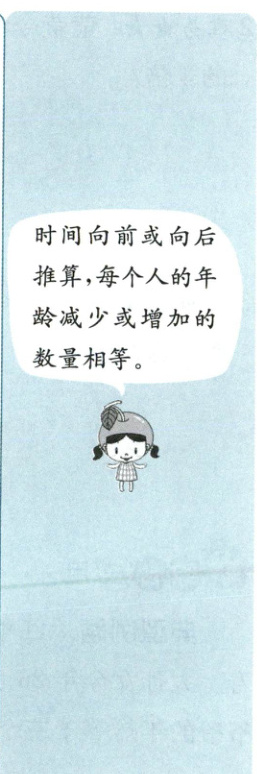 方法点睛 求几年后甲的年龄等于乙、丙、丁的年龄和,计算方法是[甲今年的年龄 - (乙今年的年龄 + 丙今年的年龄 + 丁今年的年龄)]÷(1×3 - 1)。