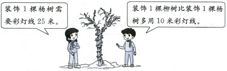 装饰 1 棵杨树需要彩灯线 25 米,装饰 1 棵柳树比装饰 1 棵杨树多用 10 米彩灯线,所以装饰 1 棵柳树需要彩灯线: