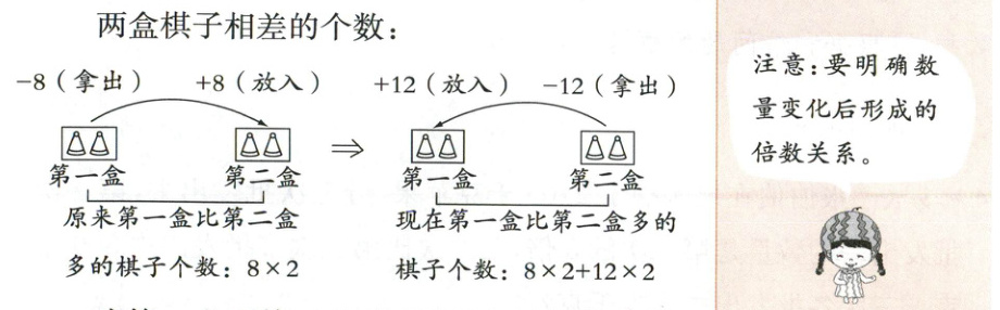 当第一盒比第二盒多(8 × 2 + 12 × 2)个棋子时,第一盒棋子的个数是第二盒的 3 倍,第一盒棋子的个数比第二盒多了(3 - 1)倍,多的(3 - 1)倍对应(8 × 2 + 12 × 2)个棋子,可求出现在第二盒棋子的个数,进而可求出原来每盒棋子的个数。