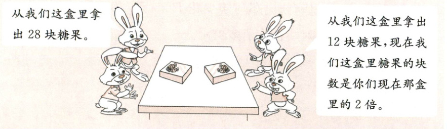 7.分析:原来两盒糖果的块数相同,从左盒里拿出28块,从右盒里拿出12块,现在右盒里糖果的块数是左盒里的2倍,现在右盒比左盒多$(28 - 12)$块,右盒比左盒多$(2 - 1)$倍,可求出现在左盒里糖果的块数,进而求出原来每盒糖果有多少块。