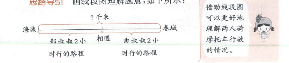 从图中可以看出,郑叔叔的速度×相遇时间+曲叔叔的速度×相遇时间=总路程;两人行驶的时间相同,两人的速度和×相遇时间=总路程,即(郑叔叔的速度+曲叔叔的速度)×相遇时间=总路程。