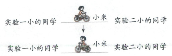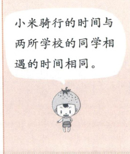 要求两所学校的同学相遇时,小米共行了多少米,需要知道小米骑行的时间和速度。画图理解小米骑行的情况,如下图所示: