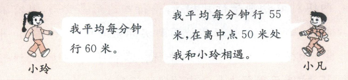 6. 小聪和小欢同时从各自的家出发,相向而行。小聪平均每分钟行70米,10分钟时小聪已超过中点50米,这时与小欢还差30米相遇。小欢平均每分钟行多少米?