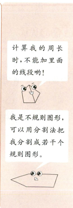 (3)不规则图形6条边的长度和就是这个不规则图形的周长。
