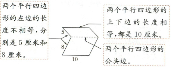 1. 由平行四边形对边相等的性质,两个平行四边形的上下边均为10厘米,左边边长分别为5厘米和8厘米,对应的右边边长也分别为5厘米和8厘米。