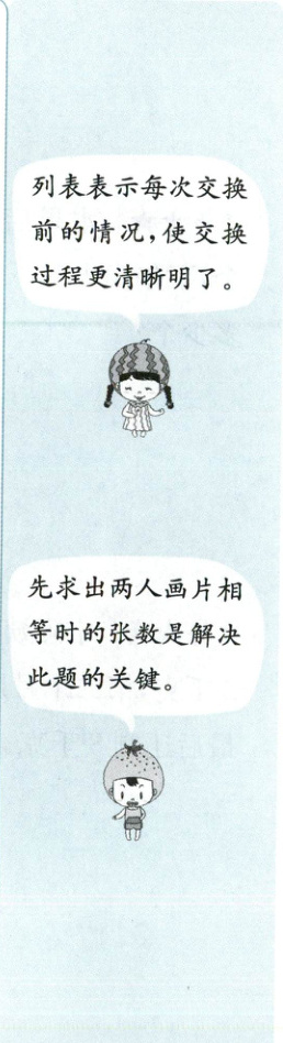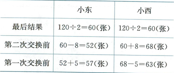 思路导引 画片的总数不变,经过两次交换,两人画片的数量相等,先求出两人画片相等时的数量,即 $120÷ 2 = 60$(张),从 60 张开始倒推,求出最开始两人画片的数量。