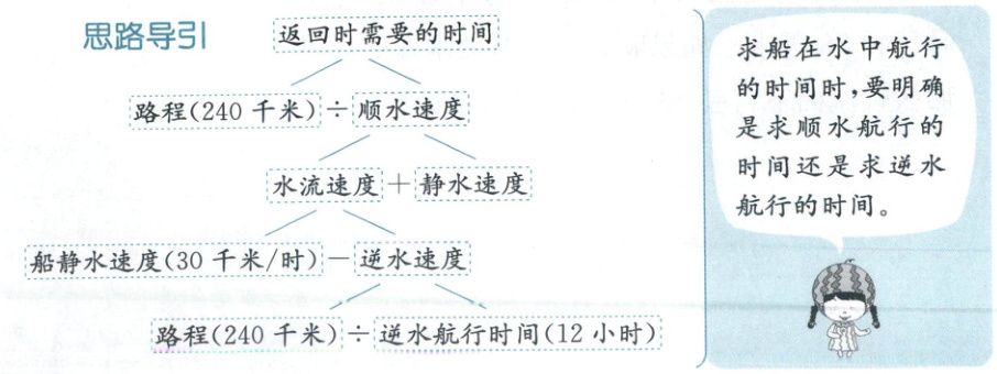 典型例题 刘叔叔驾船在静水中每小时航行 30 千米,如果刘叔叔驾船从甲港逆水航行 240 千米到达乙港,用了 12 小时,那么刘叔叔驾船沿原路返回顺水航行需要用几小时?