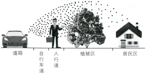 2. 在优先考虑降低颗粒物对居民区影响的同时,为尽量减少其对行人的影响,该都市从人行道到居民区绿化植被配置合理的是(