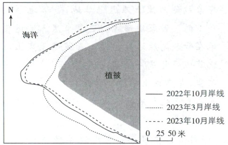 [湖北 2025·11]西北太平洋某珊瑚岛礁属热带季风气候,呈长条形,沙堤环绕,植被繁茂。该岛沙嘴区受盛行风主导呈季节性变化,亦受波浪和潮汐作用。此外,极端风暴事件也会对沙嘴区造成重要影响。移动固沙障根据需要灵活布设。下图示意 2022 年 10 月~2023 年 10 月该岛沙嘴区的岸线变化。据此完成下题。