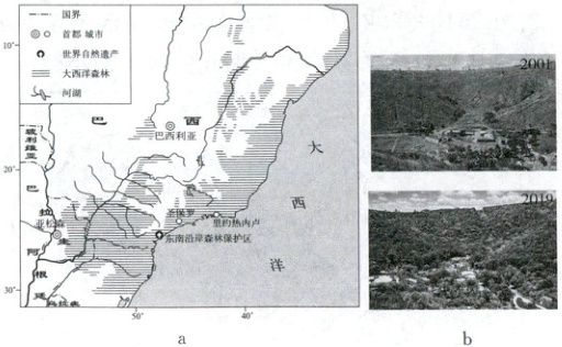 3. [北京 2023·19(1)](4 分)1944 年,摄影师萨尔出生于巴西东南部一个 1500 平方千米的农庄,农庄一半属于大西洋森林。图 a 示意大西洋森林的分布,图 b 是 2001 年和 2019 年萨尔家族农庄景观。读图,回答下题。