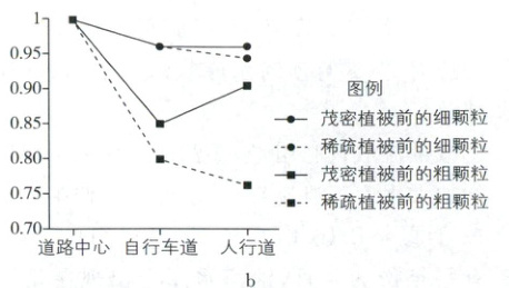 [湖南 2024·11]某大都市城市用地紧缺,道路与居民区距离较近,交通排放颗粒物对居民区有一定的影响,绿化植被可减轻此影响。在该都市采样监测发现,不同植被类型对颗粒物的拦截效果不同。图 a 示意采样监测区基本情况。图 b 显示道路中心、自行车道、人行道与道路中心的颗粒物浓度的比值。据此完成下面小题。