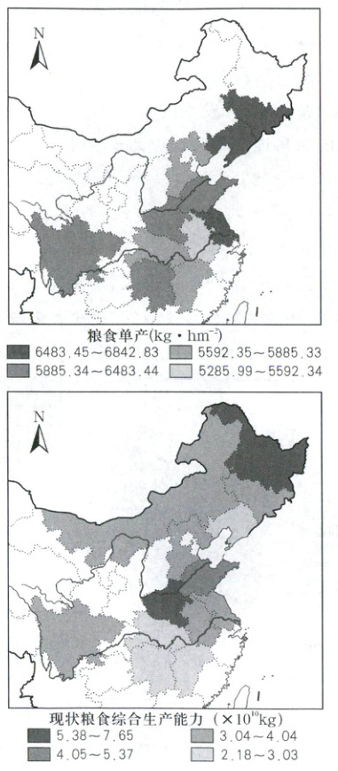 5.C 【解析】本题考查我国耕地资源开发利用现状。由图并结合所学可知,我国粮食单产东高西低,A不符合题意;我国耕地面积总体是北多南少,B不符合题意;由所学及现状粮食综合生产能力可知,农业机械化水平总体是北高南低,C符合题意;现状粮食综合生产能力北方总体高于南方,呈现北高南低的特点,D不符合题意。故选C。