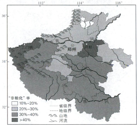 [山东青岛 2025 高二期末]粮食安全是治国安邦的“压舱石”。我国耕地资源紧缺,耕地由种植粮食作物改种非粮食作物的现象,称作种植结构的“非粮化”。下图为河南省 2020 年种植结构“非粮化”水平分布图。读图,完成下面小题。