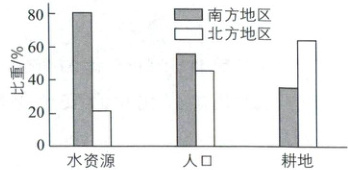 [重庆普通高中学业水平测试 2025 模拟三]下图是我国南北方水资源、人口及耕地比重对比图。读图,完成下面小题。