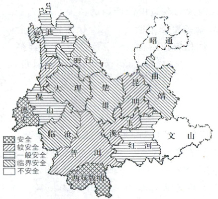 [黑龙江大庆 2025 高二期中]水资源安全是一个国家(或地区)实际占有水资源数量、质量和供给结构,能够稳定、持续、及时与足量地保障该国(或地区)社会、经济当前的发展需求和可持续发展需要的状态和能力。下图为云南省水资源安全程度示意图。据此完成下面小题。