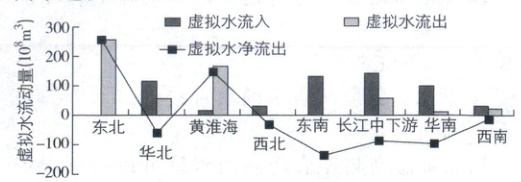 8.A 【解析】本题考查影响粮食虚拟水流动的因素。材料信息表明,虚拟水是指生产产品和服务的过程中所消耗的水,因此粮食虚拟水是指粮食生产过程消耗的水资源,某区域如果输出粮食,即粮食虚拟水流出,如果输入粮食,即粮食虚拟水流入。图中显示,我国东北地区和黄淮海地区粮食虚拟水净流出为正值,这是因为我国东北地区和黄淮海地区耕地面积大,粮食产量高,有大量商品粮输出,因此影响粮食虚拟水流动的主要因素是耕地资源,A符合题意;与我国南方地区相比,我国东北地区和黄淮海地区的水资源并不占优势,因此水资源不是导致我国东北地区和黄淮海地区粮食虚拟水净流出的原因,B错误;交通运输和政策调配不是粮食输出和输入的重要影响因素,因此也不是影响粮食虚拟水流动的主要因素,C、D错误。故选A。
