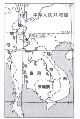 某年年初,越南南部的湄公河三角洲遭受百年以来最严重的旱灾,应越南政府请求,中国启意中南半岛轮廓及景洪水电站位置。读图完成下面小题。