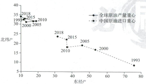 [北京丰台区2025高二月考]下图为中国原油进口重心与全球原油产量重心移动路径示意图。据此完成下面小题。
