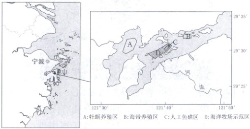 [热点情境][山西晋城一中 2024 高二月考]蓝碳,又称“蓝色碳汇”或“海洋碳汇”,是指海洋活动及海洋生物吸收大气中的二氧化碳,并将其固定、储存在海洋生态系统中的过程、活动和机制。2023 年 2 月 28 日,宁波市公共资源交易网进行全国首单蓝碳拍卖,象山西沪港渔业一年约 2340.1 吨蓝碳成交额近 25 万元。下图为象山县海域海产养殖分布图。据此完成下面小题。