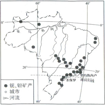 [江苏连云港2025高二月考]铌和钽是主要应用于冶金、电子、医疗、航空航天、机械及原子能工业等领域的战略性矿产资源,巴西的铌、钽资源分别占世界总储量的98.4%和67%。我国铌、钽矿储量较少,多属贫矿,且铌、钽市场形成了“两头在外”的格局,即上游资源匮乏,中游提纯技术较发达,下游产品技术不足。下图为巴西主要铌、钽矿产分布图。完成下面小题。