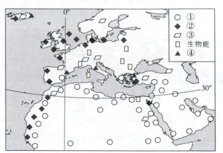 5.B [解析]本题考查能源类型。图中①能源主要分布于北非和阿拉伯半岛,这里晴天多,太阳能资源丰富;②能源主要分布于大陆西部沿海地带,受西风影响,该区域风能资源丰富;由所学知识可知,③能源多分布于河流中上游地区,该区域水能资源丰富;④能源主要分布于板块交界处附近,该区域地热能资源丰富。故选B。