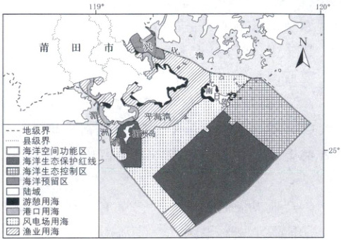 某科研小组基于福建省莆田市海域海洋国土空间开发适宜性评价结果,再结合当地社会经济发展对海洋空间资源的配置需求,划分了莆田市海洋空间功能区(如图),对莆田市海洋国土空间进行规划和开发。