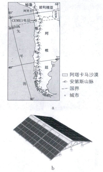 中国承建的智利最大单体光伏项目CEME1电站(位置见图a)位于智利北部玛丽亚-埃伦娜市阿塔卡马沙漠腹地。该电站是共建“一带一路”倡议下的智(利)中(国)新能源合作项目,它的太阳能电池板布设在形似屋檐的固定式“人字坡”支架上。该电站能够为约50万户智利家庭提供清洁能源,每年可减少二氧化碳排放约28万吨。图b为CEME1光伏电站“人字坡”支架示意图。