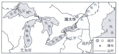 [山西卓越联盟2025高二联考]五大湖地区煤铁资源丰富,为北美传统老工业区,该地区的淡水储量约占世界淡水资源的21%、美国淡水量的90%,是世界上最大的地表淡水生态系统之一,生态系统中动植物种类繁多、结构复杂。但该湖区水污染严重,且该湖区每年的水体交换量不到1%。下图为五大湖湖区位置示意图。据此完成下面小题。