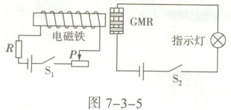 8. 如图7-3-5所示,GMR是一个巨磁电阻,其特性是电阻在磁场中会急剧减小,且磁场越强电阻越小,闭合开关S₂后,下列四种情况相比较,指示灯最亮的是()