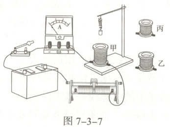 10. 同学们用如图7-3-7所示装置探究“影响电磁铁磁性强弱的因素”,器材中的元件匹配,铁架台上方的弹簧下挂有适当的铁块,并调整至适当位置,甲、乙、丙分别为100匝、50匝、30匝的电磁铁。