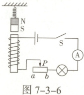 9. 如图7-3-6所示,在电磁铁的正上方用弹簧挂一条形磁体。当开关闭合后,条形磁体与电磁铁的相互作用为(选填“吸引”或“排斥”)。在滑片P从b端到a端滑动的过程中,电流表的示数会(选填“增大”或“减小”),弹簧的长度会变(选填“长”或“短”)。