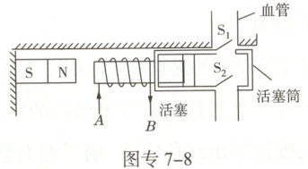 10. 中考新考法 模型建构 如图专7-8所示是推动血液循环的“人工心脏泵”,线圈AB固定在用软铁制成的活塞筒上,这就相当于,通电时线圈与活塞筒组成的系统与固定在左侧的磁体相互作用,从而带动活塞运动,活塞筒通过阀门与血管相通,阀门S₁只能向外开启,S₂只能向内开启。当线圈中的电流从A流向B时,活塞向(选填“左”或“右”)运动,阀门(选填“S₁”或“S₂”)开启,血液进入(选填“血管”或“活塞筒”)。