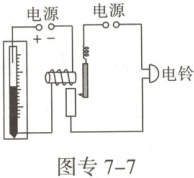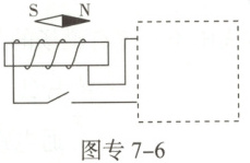8. 将图专7-6中的电磁铁连入你设计的电路中(在虚线框内完成),要求:能改变电磁铁磁性的强弱,闭合开关后,小磁针受力静止时,其N极指向如图所示。