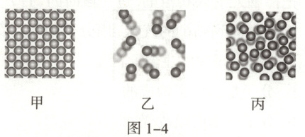 11. (2分)如图1-4所示,是同种物质的三种不同状态下的分子结构,其中丙图表示物质处于(选填“固”“液”或“气”)态,物质从丙图变化到乙图时,组成物质的体积变大,分子间作用力(选填“变大”“变小”或“不变”)。