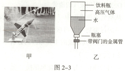 9. 图2-3甲是小明用饮料瓶制作的水火箭,图乙是水火箭的示意图。小明先在瓶里装适量水,然后将带有阀门的金属管插入瓶塞,旋紧瓶塞后用打气筒往瓶里打足气;打开阀门后,水从金属管向下喷出,水火箭向上飞向空中。下列分析错误的是()