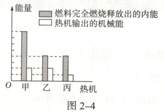 10. 如图2-4所示为甲、乙、丙三台使用不同燃料的热机完全燃烧1 kg燃料所释放的内能和热机输出机械能的二维柱状图。三台热机的转速和效率始终保持不变。根据图中的信息,下列选项正确的是()