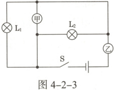 8. 如图4 - 2 - 3所示电路,甲、乙分别为电压表或电流表,闭合开关后两个灯泡都能发光,则电表甲和乙分别是(