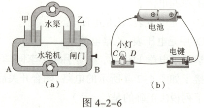 11. 在电路中导体接通电源后,自由电荷在导体中定向移动形成电流。对电流的形成过程,人们通常用图4 - 2 - 6(a)水流的形成过程来类比。