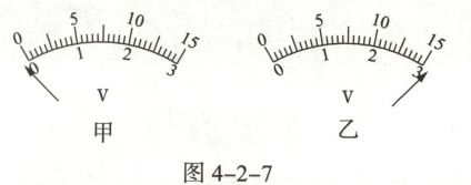 12. 某同学在用电压表测电压,将电压表接入电路时,闭合开关前发现指针偏转情况如图4 - 2 - 7甲,这是因为